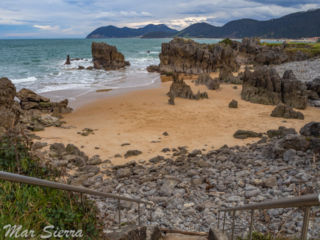 Al final de la playa, además de la salida normal, en bajamar podemos llegar hasta una escalera que sube al paseo marítimo, y hacia la derecha nos lleva hasta la playa de Ris por el llamado Paseo de la Costa. Varios bancos nos invitan al descanso, a la contemplación: